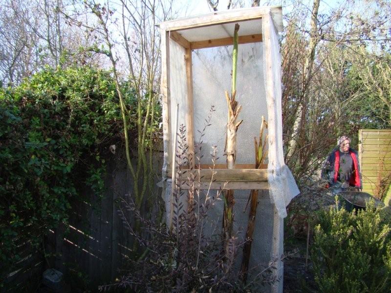 Klopt, alleen bladeren afgesneden, geen stro, blote stam in een kotje van noppenfolie, zal eens een foto doorsturen.