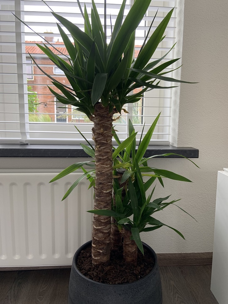 Staat direct op het raam op het oosten. Krijgt voldoende licht. Soms ook van de andere kant (westen) aangezien we doorzon woning hebben. Heb hem denk ik ongeveer in januari gekocht. Nieuwe pot erom, die was ruim 30% groter dan de kweekpot.