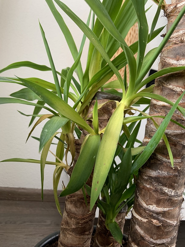 Drie stammetjes van groot naar klein. Bij de middelste worden de blaadjes geel en gaan ietwat slap hangen. Uiteraard wat je leest op internet: teveel water. Maar de grond voelt droog, zover ik kan met mijn vinger. De rest ziet diepgroen uit.