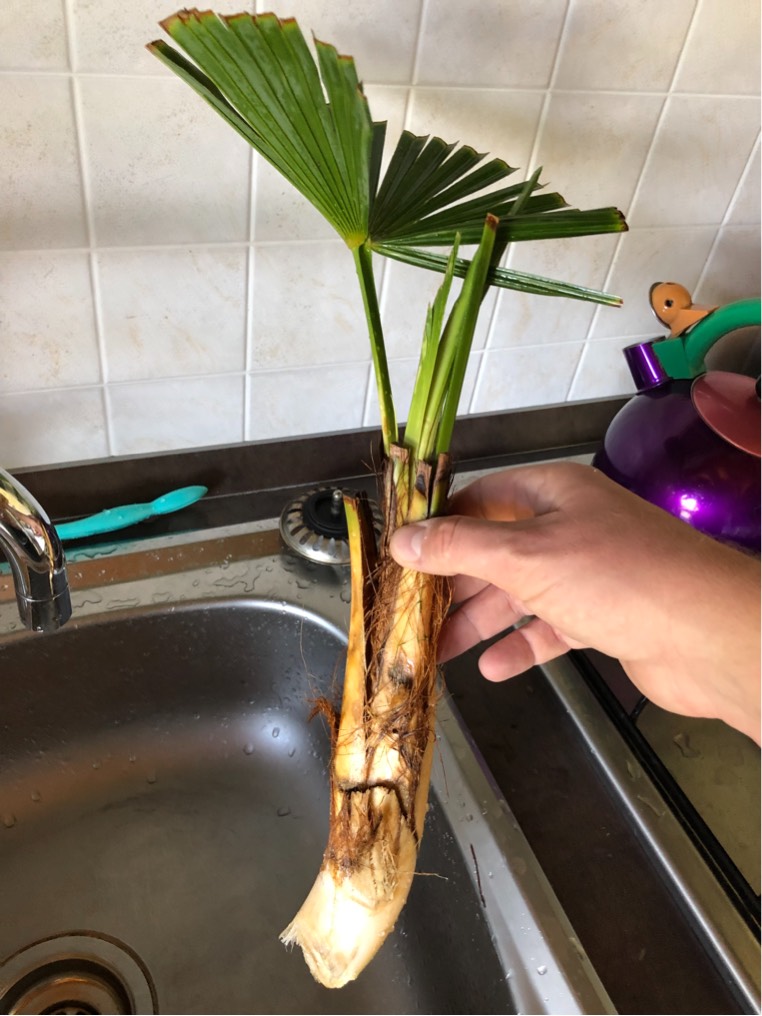 Ik heb hier geprobeerd een klein palmpje met een handschepje uit te graven, maar vermoedelijk zat hij vast aan de plant ernaast? Resultast: palmpje zonder wortels... als ik dit jn het water zet, kan hij dan weer nieuwe wortels maken of is hij ten doden opgeschreven?