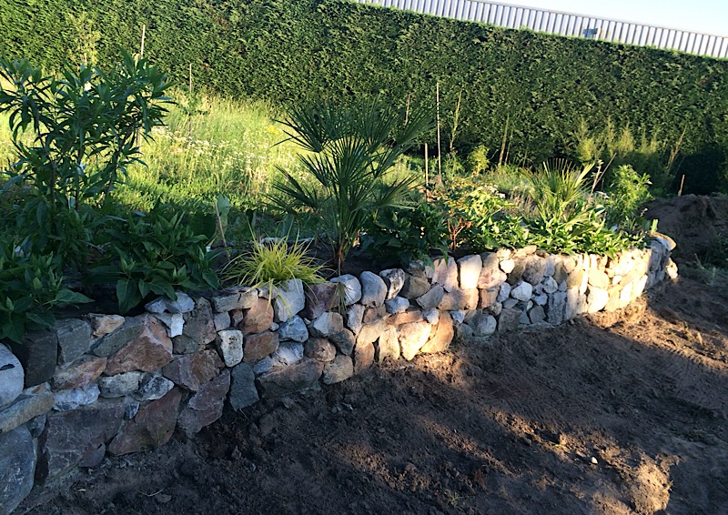 Dit wordt de ingang naar het witte zand. Er komt een ‘strandflonder’, zo’n looppaadje van planken die ook op het strand liggen. Op die manier valt het zand tussen de planken door van de voeten af. Zo blijft het zand tussen de muren en niet op het omringende gras. De bedoeling is dat het paadje aan de ingang een ‘spannend paadje’ wordt. Denk aan bush bush, zodat het zand nog niet te zien is door overwoekerend van de planten aan de zijkanten.