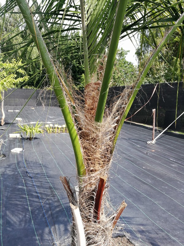 Update van de Jubutyagrus. De afgelopen winter was de winter stellage er helemaal vanaf gewaaid doordat één van de vier spanbanden was losgeschoten. Gelukkig is de palm ongedeerd gebleven. Deze winter dus iets beter vastzetten. De groei was dit jaar weer prima en ik verwacht dat hij komend jaar echt op gang komt. De meeste palmen hebben een jaar of drie nodig voordat ze echt helemaal aangeslagen zijn. Ik had stiekem al gehoopt op bloei maar dat is dit jaar nog niet gebeurd. Omdat de zandgrond hier dit jaar heel droog was heb ik hem om de paar dagen goed gesproeid.