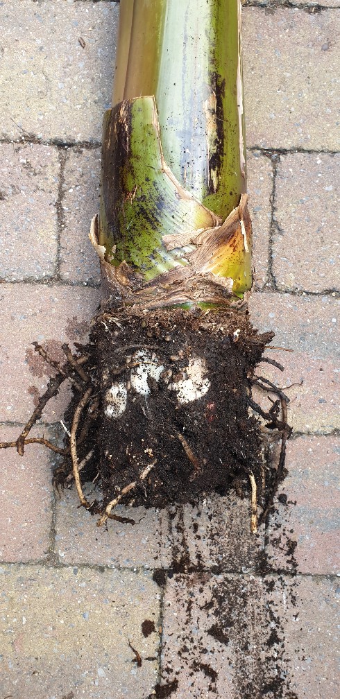 Update, 8Juli2019, stam terug gebracht naar de "base". 2 weken later nog iets bijgesneden om de blad uitloop te vereenvoudigen. Groei kwam nl bijna tot stilstand met slechts 3mm per dag. Ondertussen de stam "gewiebeld" langzaam maar zeker kwam deze stabieler en stabieler te staan. Beetje gegraven en veel, erg veel nieuwe witte gezonde wortels.
