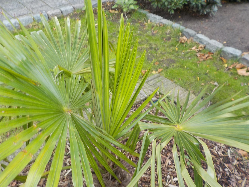 De palmen in onze tuin krijgen in het najaar een mulchlaag van herfstblad of compost. Dat biedt bescherming aan de oppervlakkig gelegen wortels tegen de vorst en bevordert de vorming van nieuwe adventiefwortels.