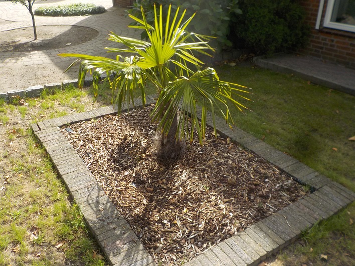 De palmen in onze tuin krijgen in het najaar een mulchlaag van herfstblad of compost. Dat biedt bescherming aan de oppervlakkig gelegen wortels tegen de vorst en bevordert de vorming van nieuwe adventiefwortels.