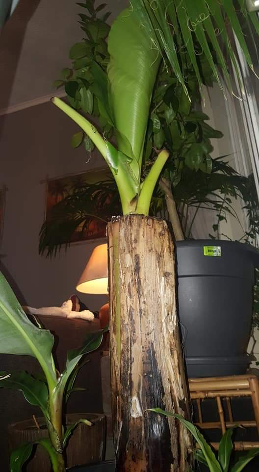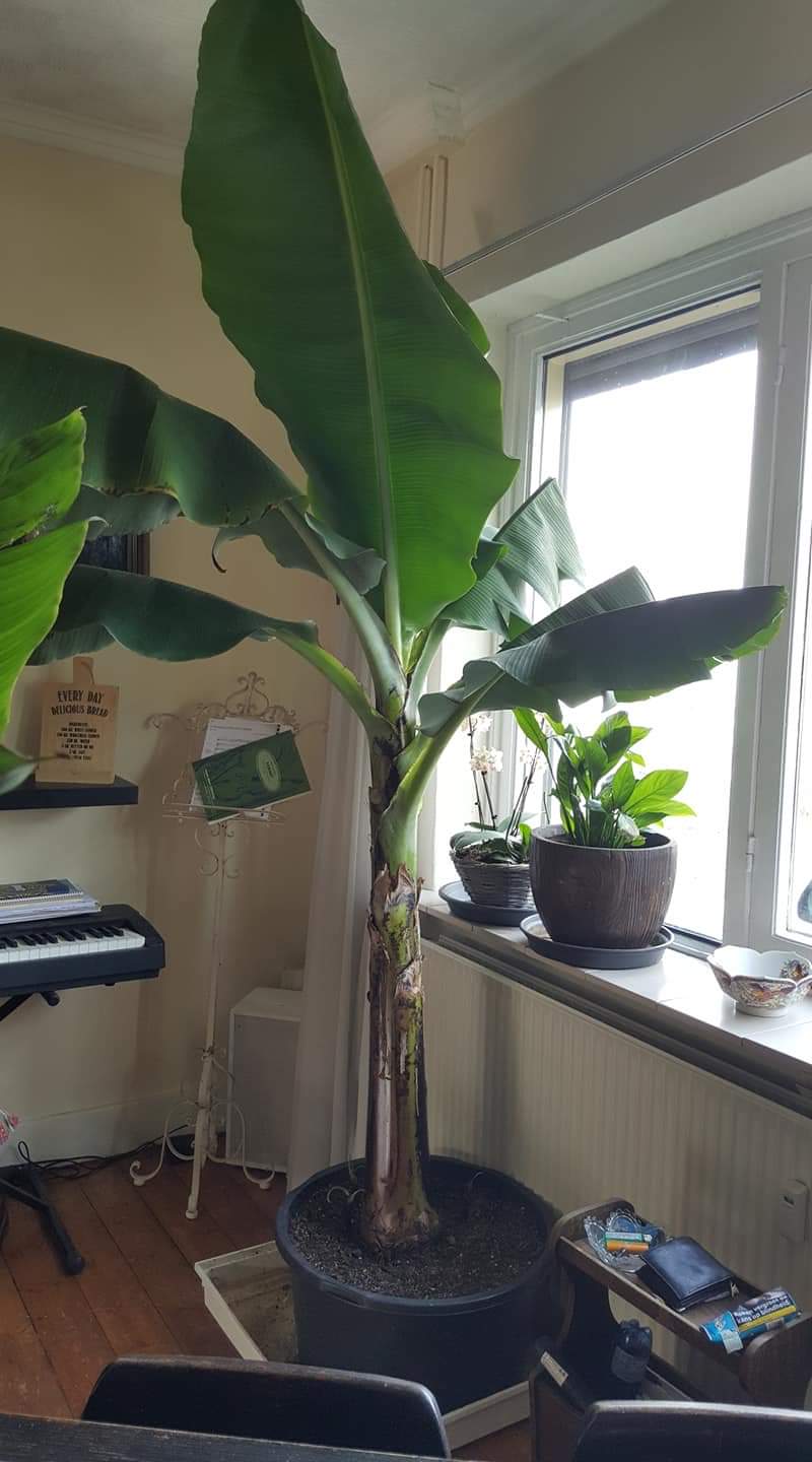 Collega met een Bonne banaan stek, ziet nu dat deze niet meer gaat passen in zijn serre.