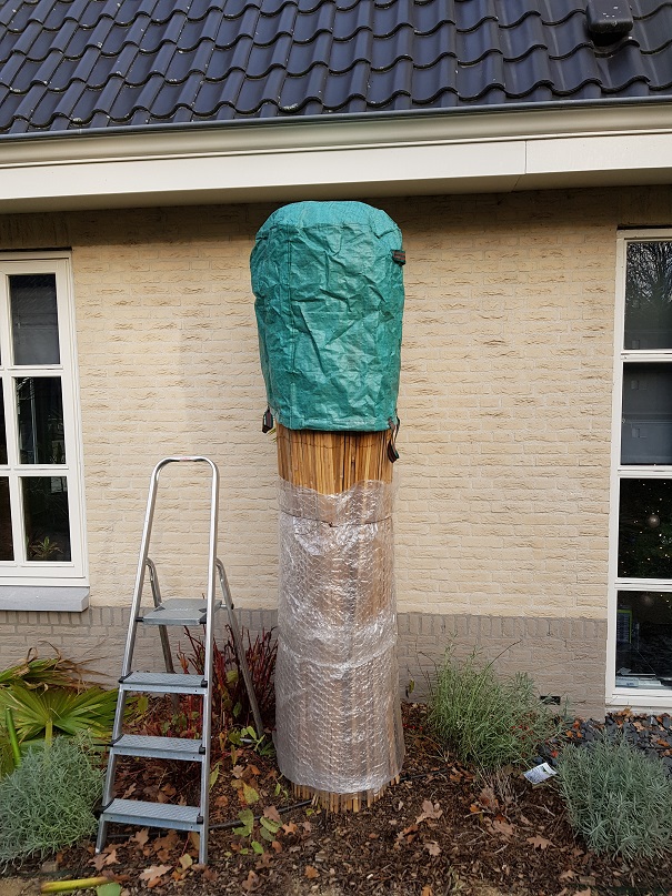 Ik pak ze in: kruin bijeen, kerst lampjes er rond, rietmat omheen wikkelen, puinzak erover, en emmer/container bovenop. Kerstlampjes pas aan beneden -5/-6.