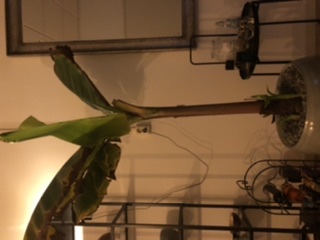 De bananenplant krijgt wekelijks 0,5 liter water en eens in de maand voeding. Hij staat op een lichte plek.