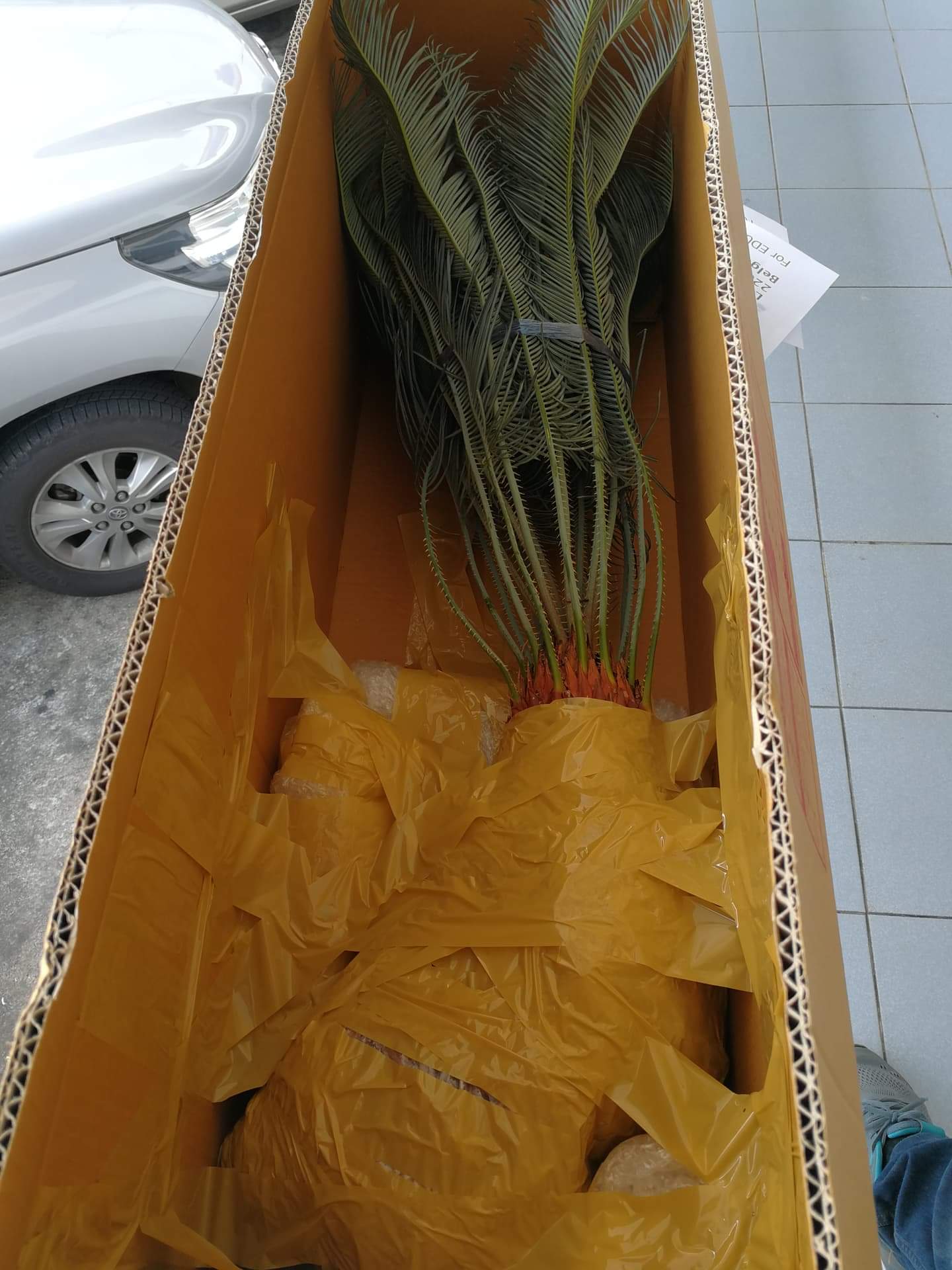 Op kleine 10 dagen was de plant geleverd waarvan 3 dagen bij douane..mits de nodige papieren moesten ze perse de cycas uitpakken en losrukken uit de doos..met enkele wortels gekrakt als gevolg..