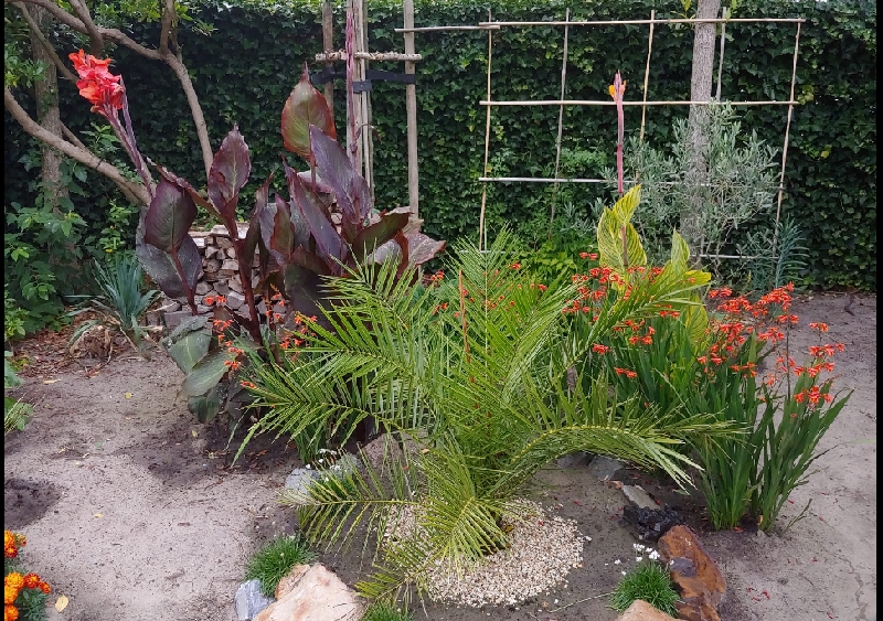 Ik ben hier niet nieuw maar heb nu sinds dik een jaar een eigen stek (15are). Dus in de achterzijde van de achtertuin al veel veranderingen gedaan. Waaronder deze phoenix aangeplant begin April. Ook canna's gingen de grond in, een olijfje, een chilensis,... De kleinere filifera eigen zaailing en grotere 3 stam Robusta van de Aldi ook in de grond. De filifera had al wat vlekken na donderdag -2,9°C in hut 150cm midden in gazon. En -6,5°C op 10cm gazon. Trouwens genoeg toen voor de bladeren van de musa stammen te vellen.