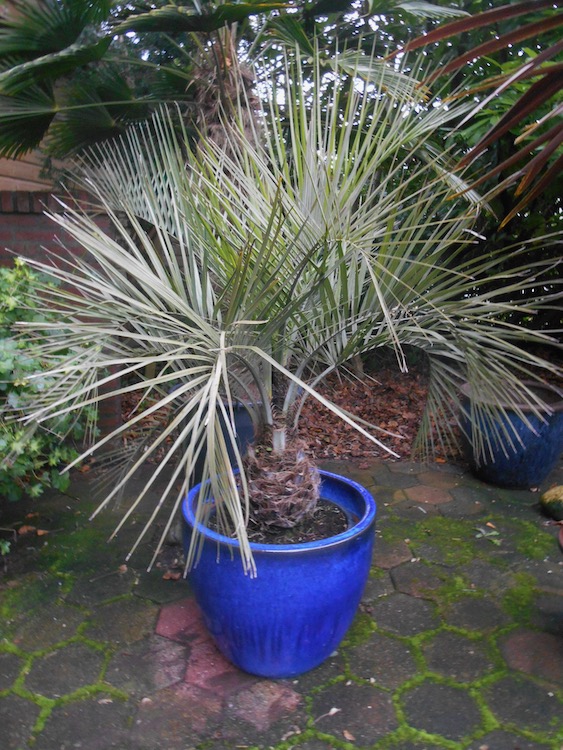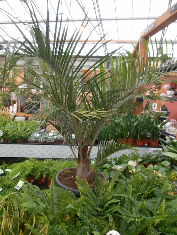 Nu de feestdagen voorbij zijn en de kerstbomen het huis uit, komt de verkoop van kamerplanten weer in beeld en pakken de tuincentra uit met bijzondere planten die de aandacht van de bezoeker trekken. Palmen lenen zich daar uitstekend voor en grote opvallende exemplaren in het bijzonder. Vorige week signaleerde ik al Ravenea rivularis, vandaag kunnen daar Archontophoenix alexandrae en Dypsis decaryi aan worden toegevoegd. Het zijn flinke exemplaren, de alexandrae palm is zo 'n 3 m hoog. Ook is nu de tijd voor de laatste koopjes zoals de kobaltblauwe sierpot met hoge korting in de opruiming.