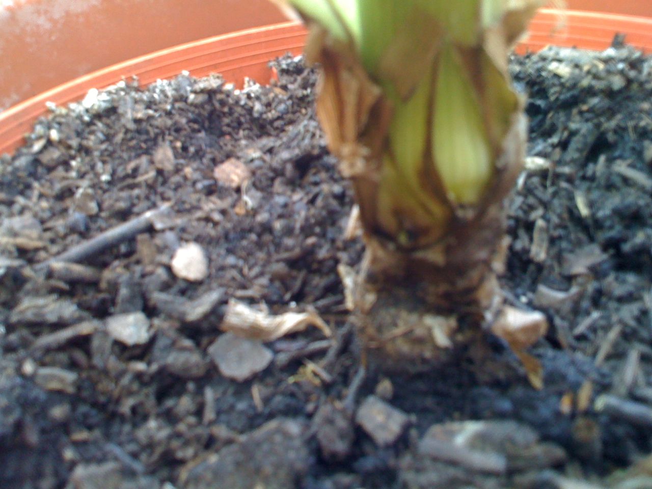 de onderste 3 cm zijn nog maar half zo dik als de rest van de stam en vlak boven die verdunning is dus een hele dikke bol waar precies allemaal scheuten tussen de oude bladeren uit komen... echt iets raars!
