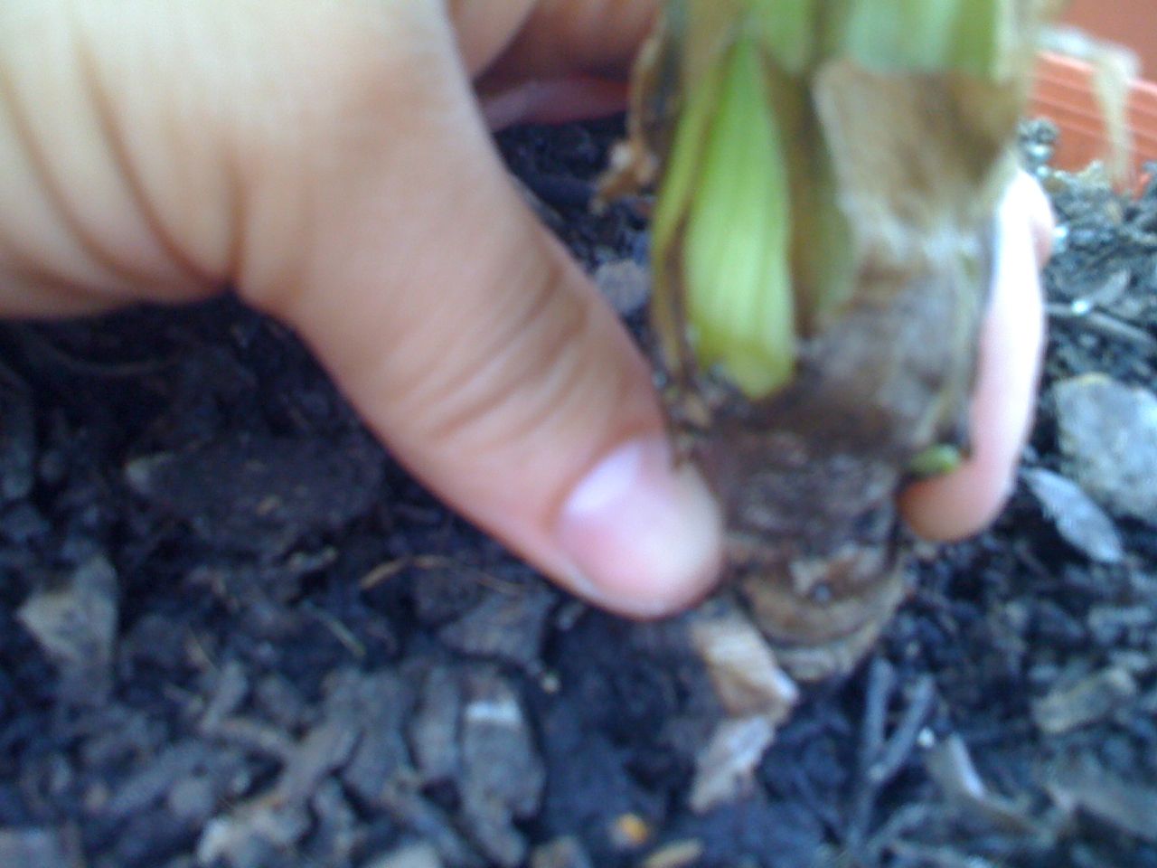 Precies een dikke bol in de stam een 3 tal cm boven de grond (de bruine bladeren zijn hier ook uiteen geschuurd). Op die bol zag ik boven precies een scheutje (dat ik perongeluk eraf gewreven heb) en vanonder een uitstulping.