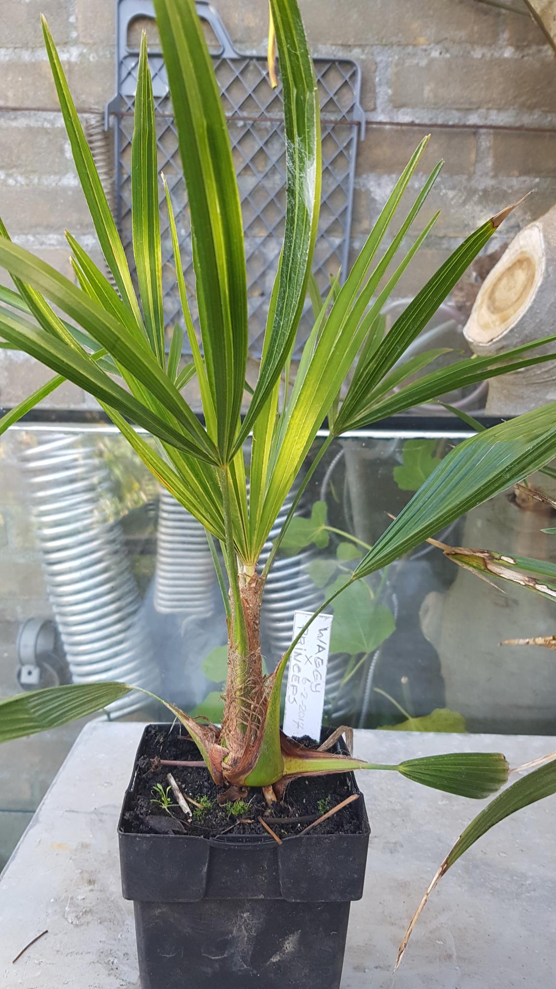 Zojuist ontvangen de hybride Trachycarpus wagnerianus x princeps. Vooralsnog lijkt de invloed van de moederplant dominant gelet op het kleine stevige blad. Deze hybride oogt duidelijk anders dan de omgekeerde kruising, i.e. princeps x wagnerianus. Het blad hiervan is zachter. Beiden missen tot nu toe het zilverwit van de princeps. Benieuwd hoe dit zich verder zal ontwikkelen.