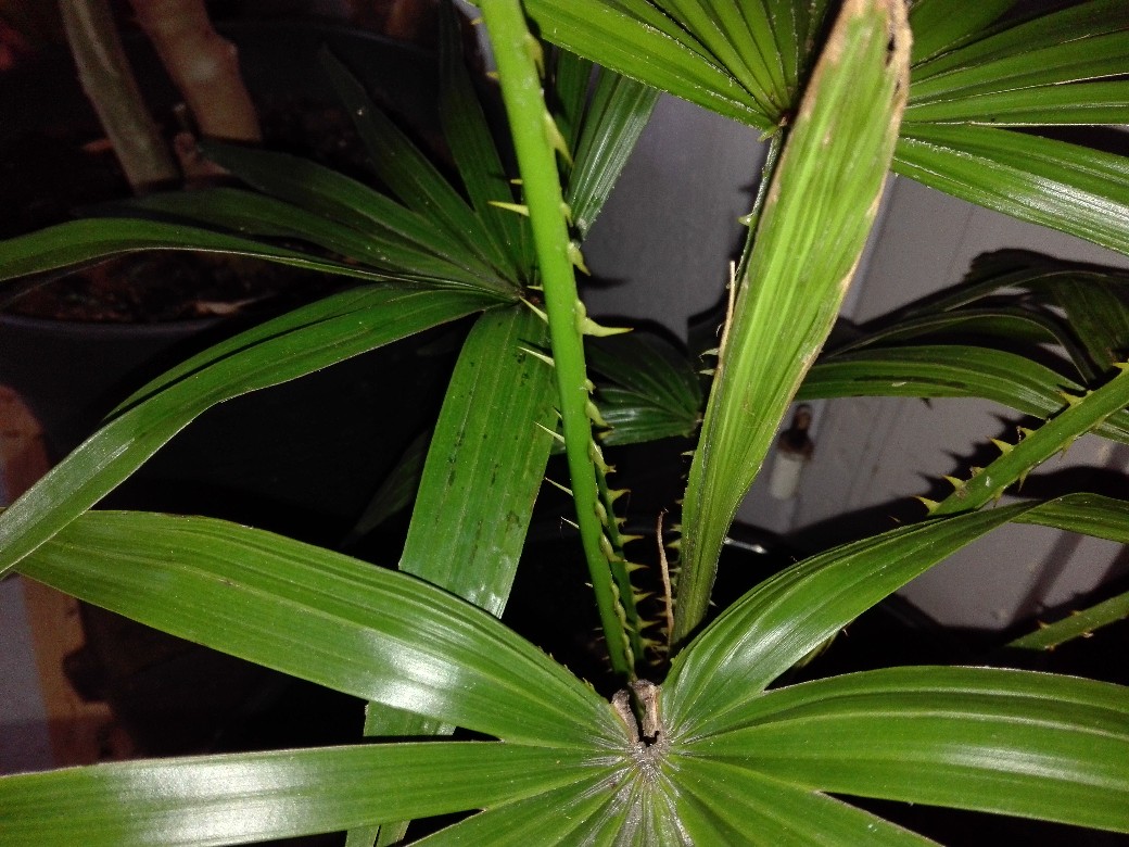 Livistona australis is berucht vanwege de scherpe haakvormige doorns op de bladstelen. Ik bleef er bij het verzorgen geregeld aan vasthaken. :mrgreen: Aan de roodbruine bladvoet mag je concluderen dat dit met zekerheid L. australis is. Zet de palm in de zomer buiten op een zonnige plek om de compacte groei te behouden. Geef deze binnenplant wel een week de gelegenheid op aan de zon te wennen.