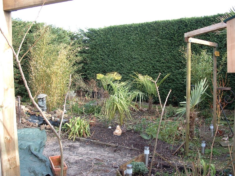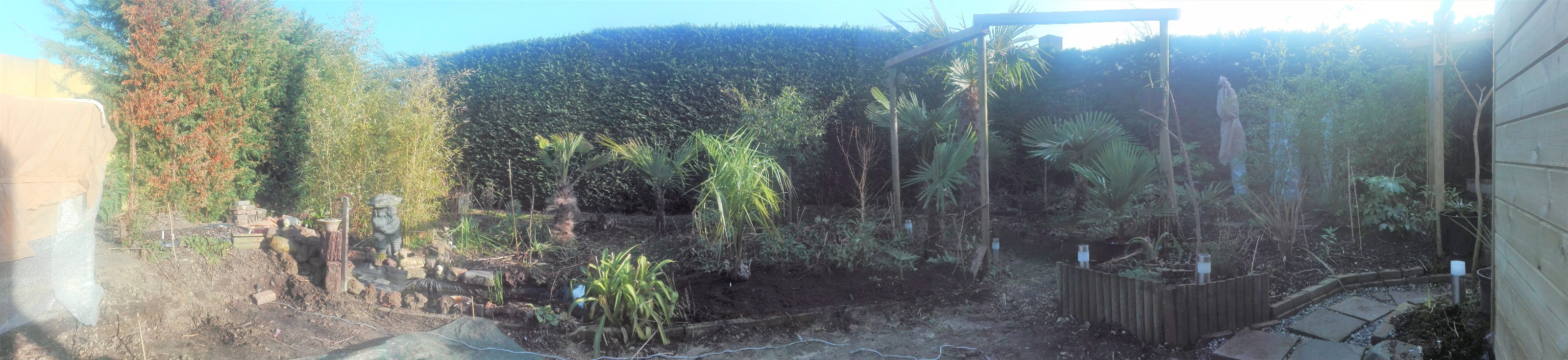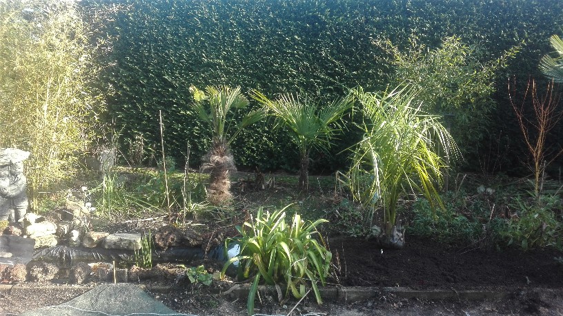 Voila eens werk gemaakt van mijn toekomstig terras. Betondals erop en dan kan de serre er ook op maar alles op zijn tijd. Die constructie is een rek met alle winterharde palmpjes op zodat ik binnen wat tijd heb. Bovenop is vliesdoek maar een vraagje daaromtrent laat dat voldoen vocht door zodat ik niet moet water geven of moet ik toch beperkt water geven?