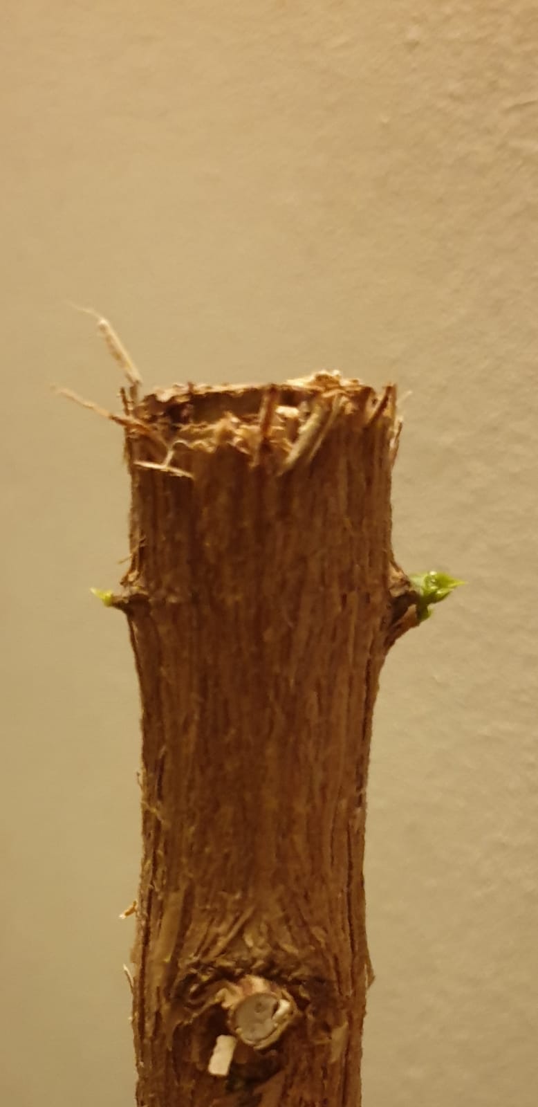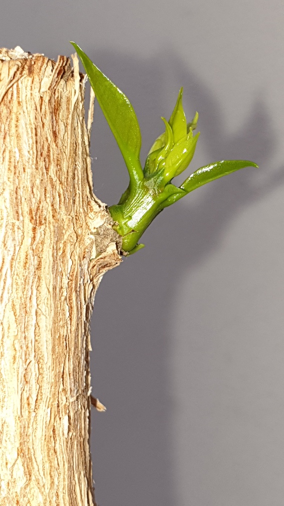 Het is nog pril maar eerst teken van groen zichtbaar. Aangezien we slechts een kale stam van 70cm hebben nu op de foto's de top van 5 cm te zien.