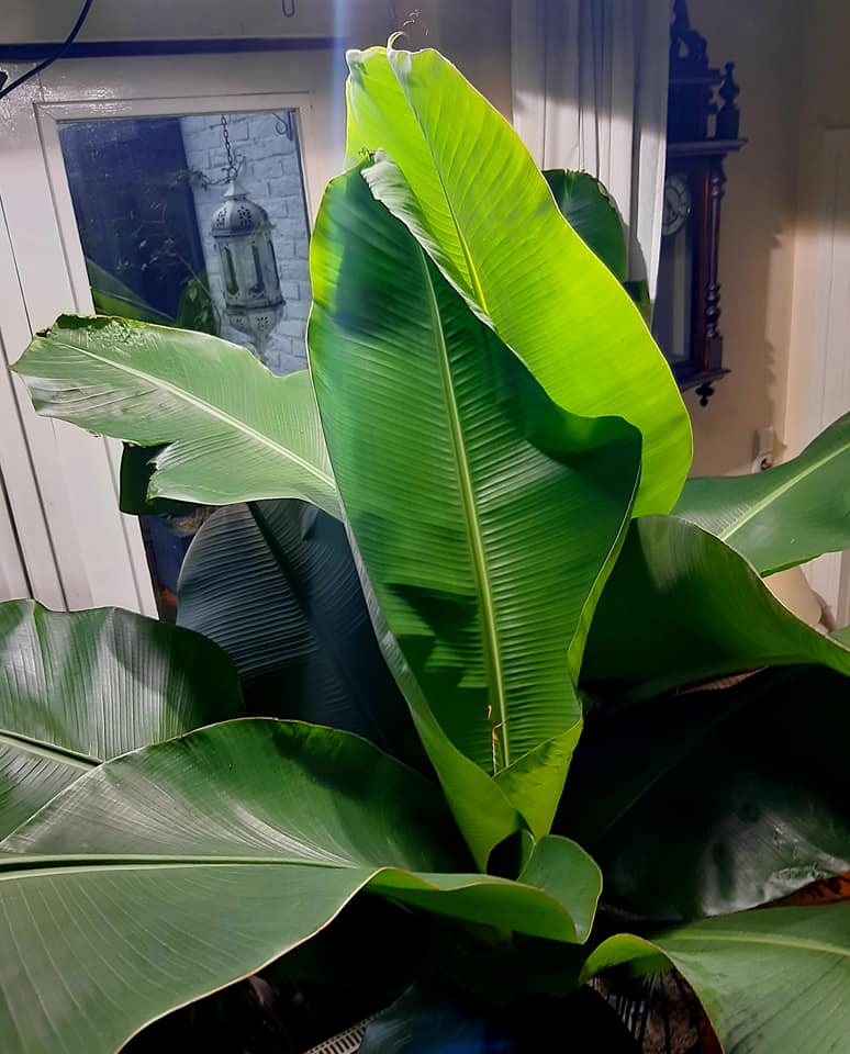 Het lijkt erop dat de banaan aan het dichtslibben is. Te veel nieuwe bladeren zonder de de oude volledig hebben kunnen uitgroeien. Hij groeit nog wel.