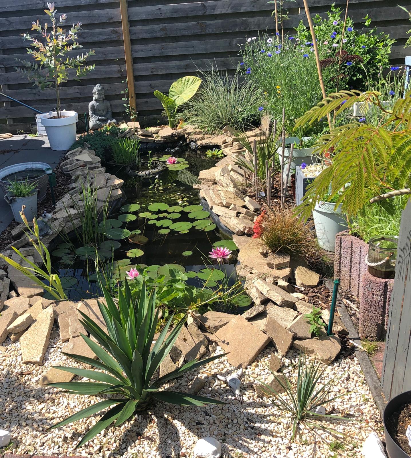 Op stenenjacht geweest en er een mooie cirkel van gemaakt. Albizia julibrissin var. Ombrella in het midden. Eromheen komen wat Agaves. De bamboebak is inmiddels weer verplaatst om toch vanaf de picknicktafel in de vijver te kunnen kijken staat hij nu in een lijn achter de Yucca’s. Dit zal toch al het laatste jaar van de bak zijn want hoewel er maar weinig bamboe bovengrond te zien is , zitten er toch al veel rizomen door de hele bak heen. Het is ook een zelf getimmerd projectje dus ik denk dat de bamboe dit uiteindelijk zal breken. Maar ik heb wel een nieuwe plek in gedachten mocht dit uiteindelijk gebeuren , zover is het nog (lang of niet zo lang) niet.