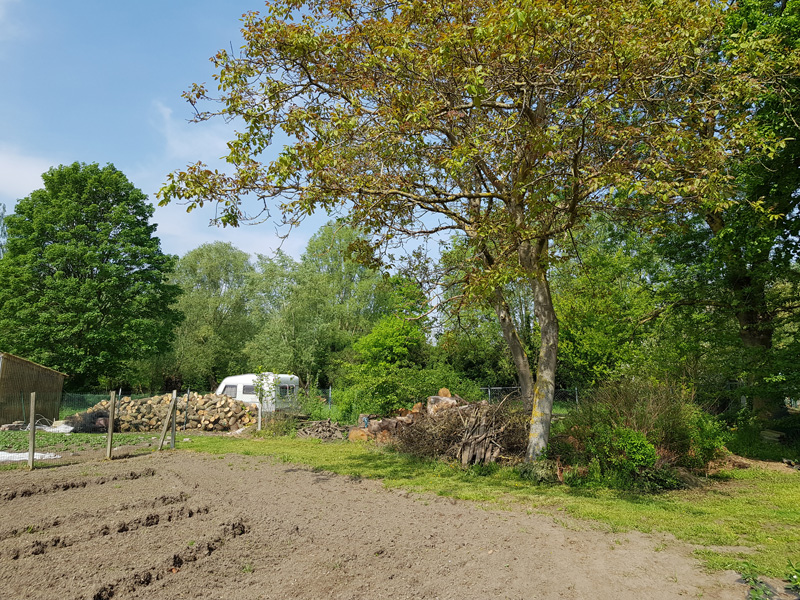 Helemaal achteraan het perceel enkele bomen en materiaal dat we bewaren voor eventuele recuperatie. En wat hout.