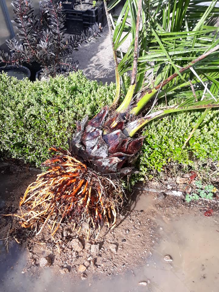 Mooi exemplaar! Ben benieuwd of je deze actie terug gaat zien in de kroon. Het lijkt er op dat Jubaea wel tegen een stootje kan. Ga je hem voorlopig in de schaduw zetten? Heb je wel eens nagedacht om een verwarmingslint rond de kuip te wikkelen om het wortelgestel te stimuleren? geen ervaring mee, maar een stukje bodemwarmte zou wel eens erg kunnen helpen met het herstel van de wortelkluit.