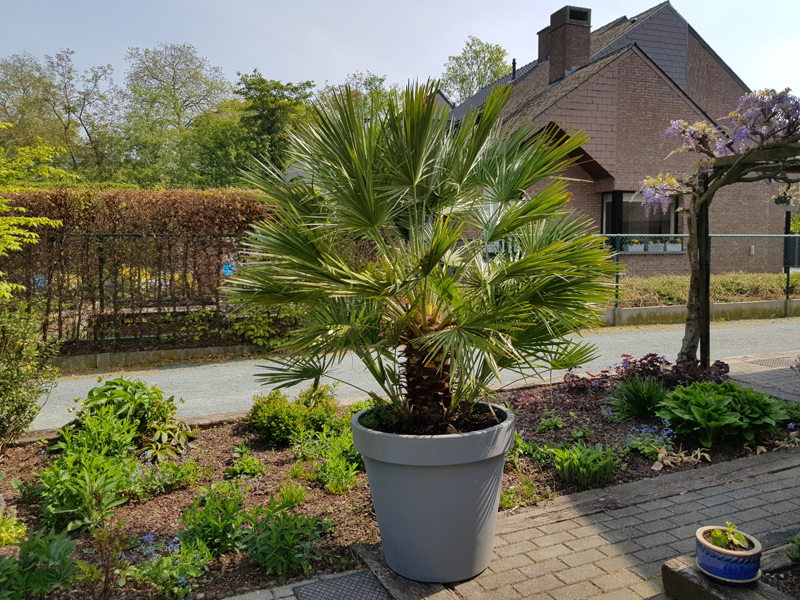 De enige palm op het domein momenteel, een humilis in pot (Eduard kent hem al). Daar zal ik hem waarschijnlijk nog even in laten, tot we beter zicht hebben op hoe en wat. Voorlopig eerst verder opkuisen, goed leggen en een gazon voorzien voor de kinderen deze zomer.