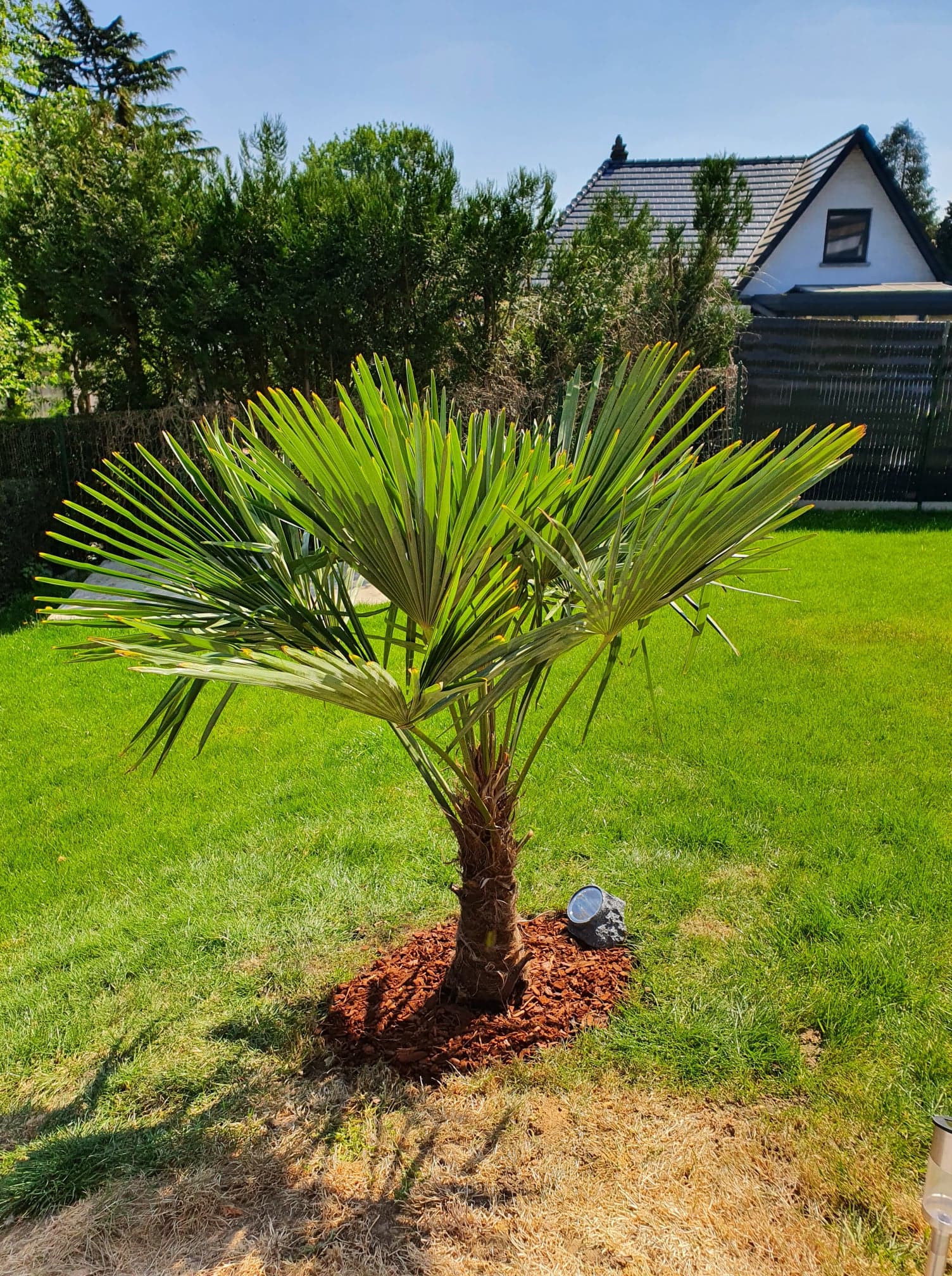 Een speer is een blad dat nog niet is opengevouwen. Zo te zien staan die hier nog fier overeind. Een pas aangeplante palm kan bij warm weer wel wat extra water gebruiken. De bladeren zien er 'geknepen' uit wat kan duiden op watergebrek?