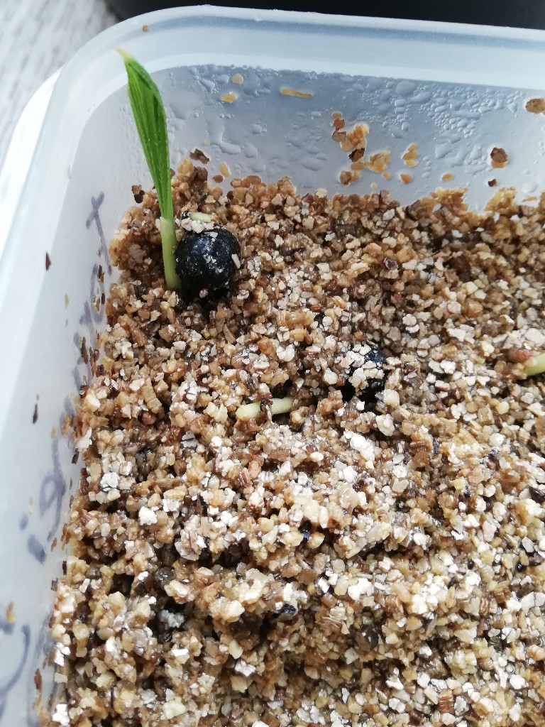 Omdat ik ontzettend veel zaden heb gekregen ben ik dingen gaan uitproberen. Zo heb ik ongeweekte zaden in een plastic Bossche bollen doosje met vermiculiet gedaan, samen met wat andere zaden, bamboe en Pilea peperomiodes (pannenkoekplantje). Dit doosje heb ik bij een raam gezet waar in de ochtend de zon op staat. Al snel zag ik groen tevoorschijn komen bij wat een pannenkoekplantje zou moeten zijn. Spannend! Binnen enkele dagen bleek het geen pannenkoekplantje te zijn maar klaver... Hmmm. Verder gebeurde er niets in mijn prachtige Bossche bollen kasje. Gevolg: deze werd verwaarloosd. Tot ik toch maar eens een kijkje ging nemen of er onder de vermiculiet toch iets was gebeurd. Verrassing! De Trachycarpus zaden waren gekiemd en hoe! Geweldig dat er toch beweging in zat. Inmiddels staan deze zaden in een hoge pot zodat ze mooi kunnen opgroeien. Hier is na enkele dagen op het vb oog niet veel gebeurd.