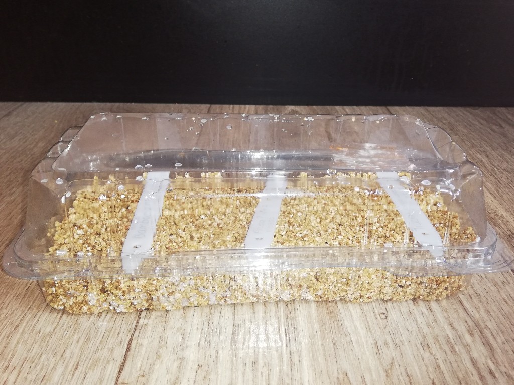 Omdat ik ontzettend veel zaden heb gekregen ben ik dingen gaan uitproberen. Zo heb ik ongeweekte zaden in een plastic Bossche bollen doosje met vermiculiet gedaan, samen met wat andere zaden, bamboe en Pilea peperomiodes (pannenkoekplantje). Dit doosje heb ik bij een raam gezet waar in de ochtend de zon op staat. Al snel zag ik groen tevoorschijn komen bij wat een pannenkoekplantje zou moeten zijn. Spannend! Binnen enkele dagen bleek het geen pannenkoekplantje te zijn maar klaver... Hmmm. Verder gebeurde er niets in mijn prachtige Bossche bollen kasje. Gevolg: deze werd verwaarloosd. Tot ik toch maar eens een kijkje ging nemen of er onder de vermiculiet toch iets was gebeurd. Verrassing! De Trachycarpus zaden waren gekiemd en hoe! Geweldig dat er toch beweging in zat. Inmiddels staan deze zaden in een hoge pot zodat ze mooi kunnen opgroeien. Hier is na enkele dagen op het vb oog niet veel gebeurd.