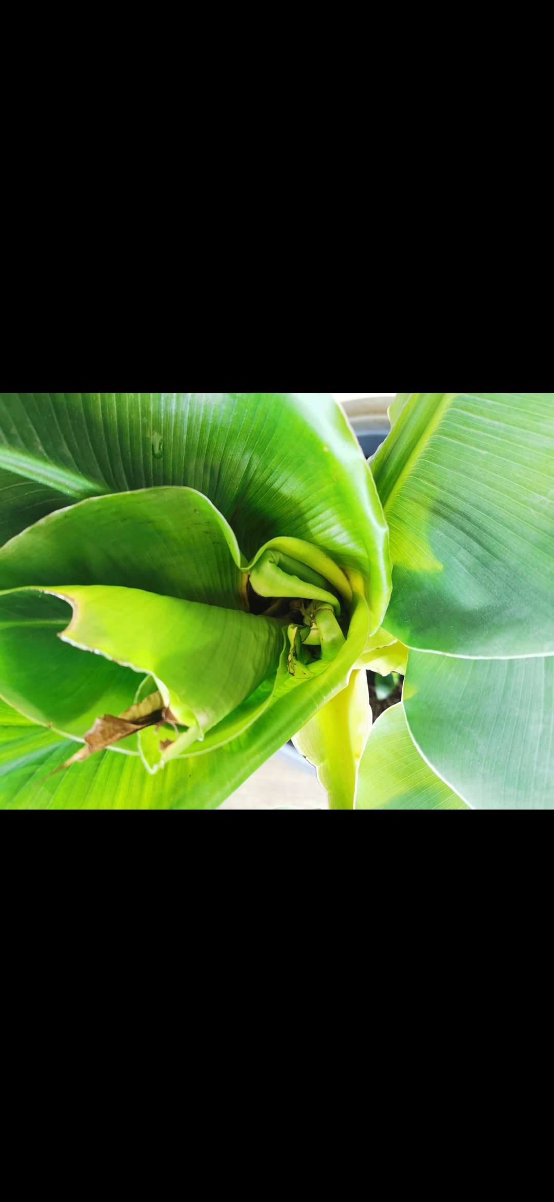 Wie kan mij vertellen wat hiermee mis is? :o Deze musa super dwarf is van mijn vriend, maar we snappen beide niet wat er mis gaat. De bladeren groeien allemaal over elkaar en het ene blad is nog niet ontrold of er komen al weer nieuwe aan.. De stam ziet er voor de rest gezond uit en de bladeren zijn mooi groen.