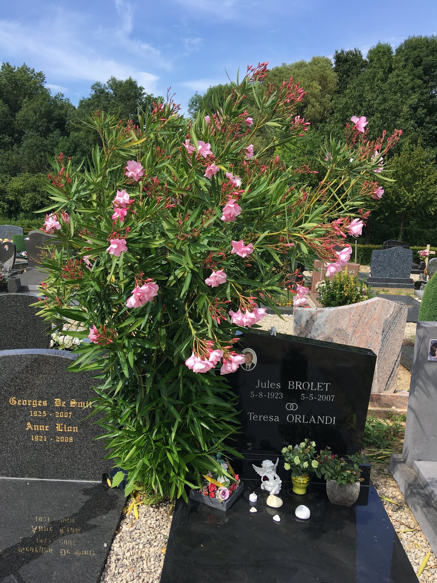 Ik wou even mijn mooiste oleander met jullie delen. Hij staat reeds 8 jaar in het kerkhof waar mijn vader is begraven. 30 cms hoog was het plantje. We zijn verplicht om ieder jaar flink te snoeien anders wordt het een monster.