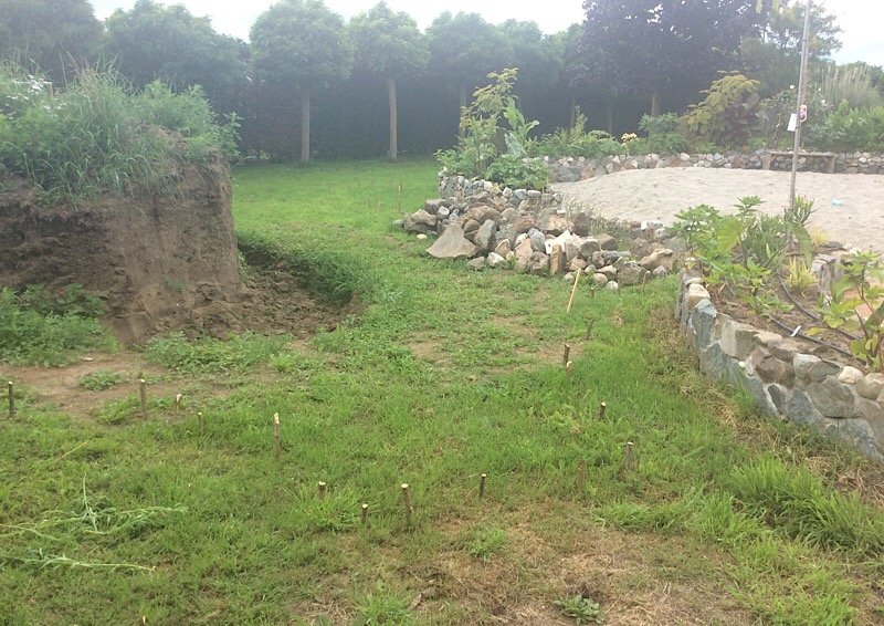 Daar gaat de zwemvijver komen met waterval. De omtrek is uitgezet...