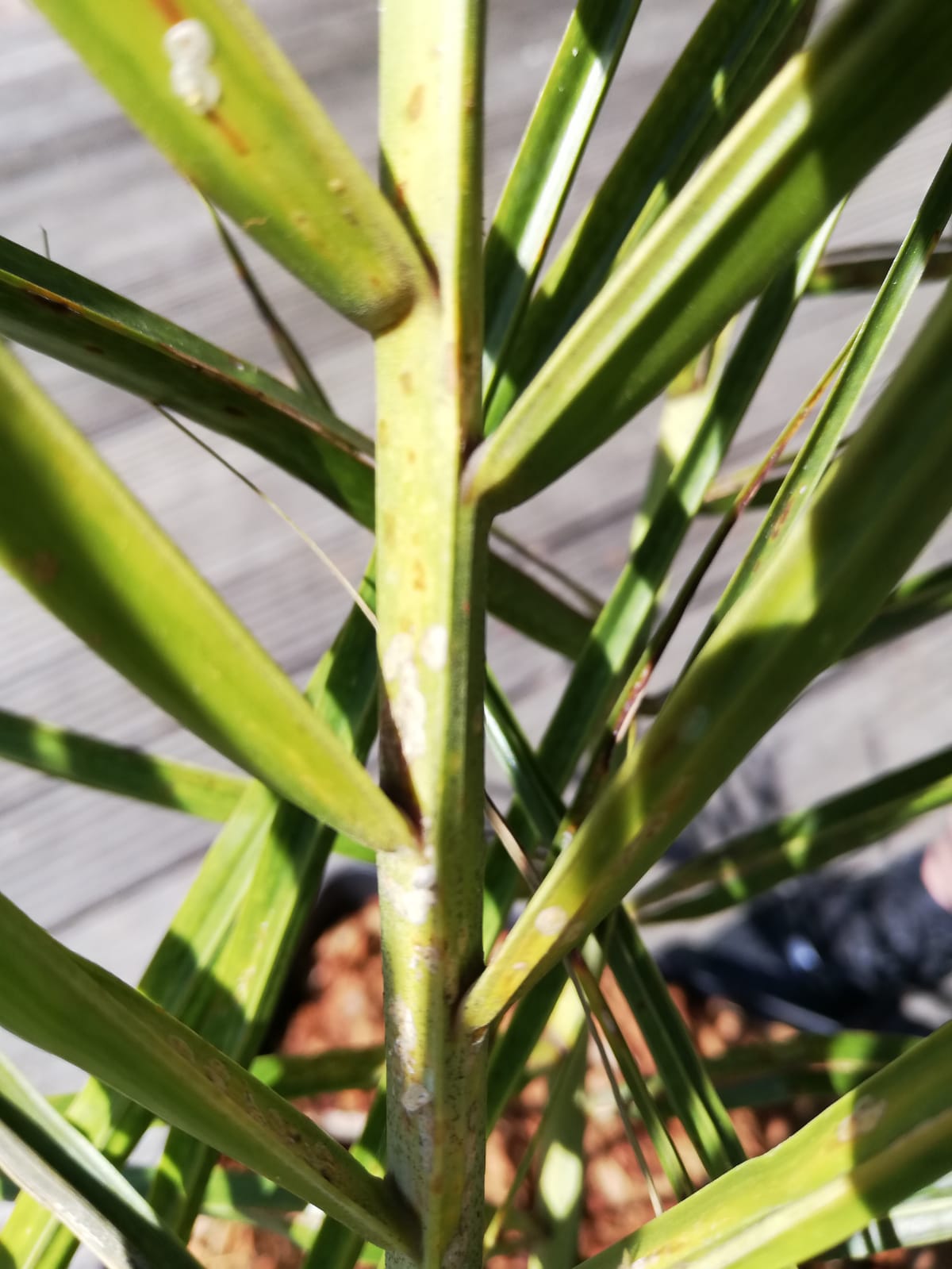 Ik heb al een paar jaar een Jubaea in pot in de tuin staan. Sinds dit voorjaar is hij een stuk geler geworden en sinds enkele weken zie ik steeds meer witte puntjes op het blad. Ik vermoed dat het schildluis is maar ik kan het niet precies vaststellen. Iemand die de witte plekken op de foto's herkent? En mij advies kan geven over hoe ik er weer vanaf kan komen???