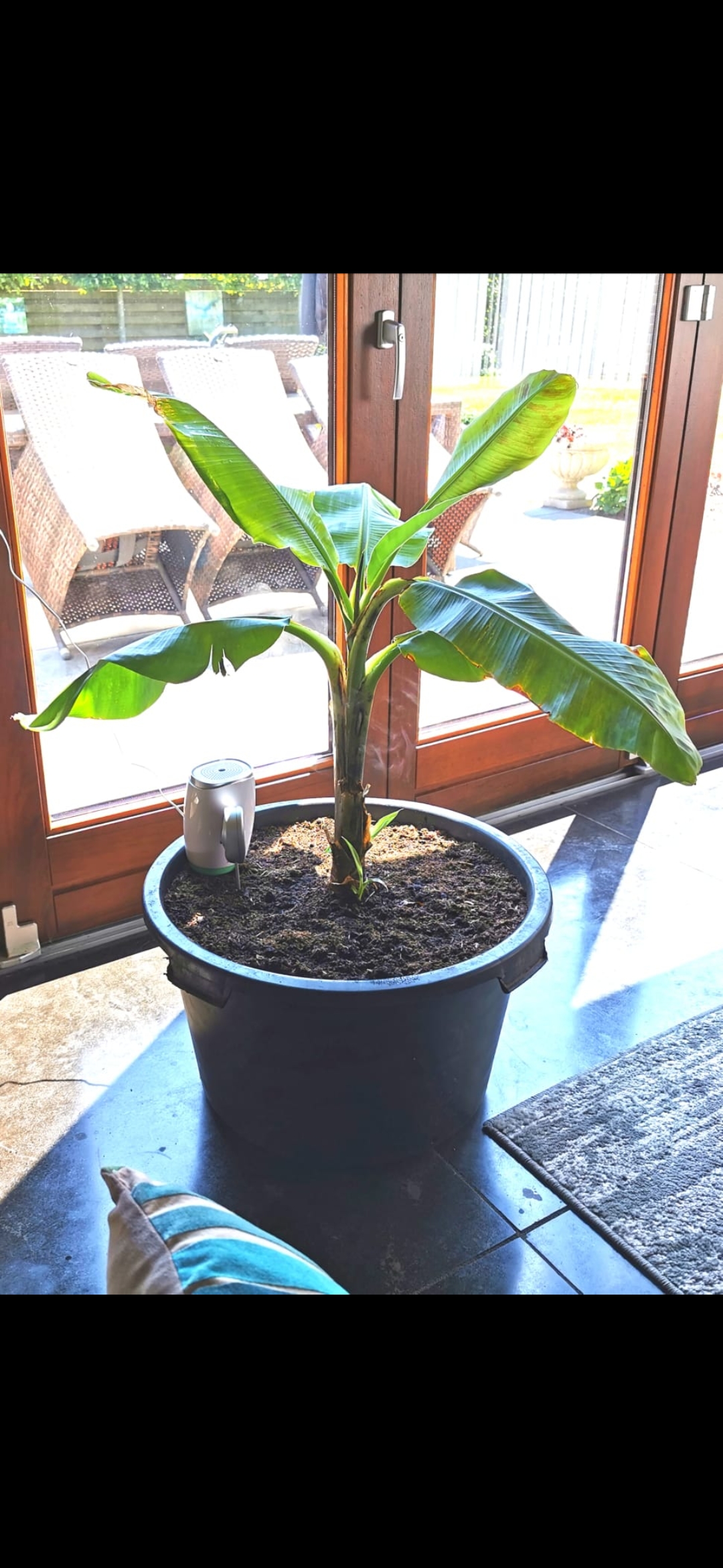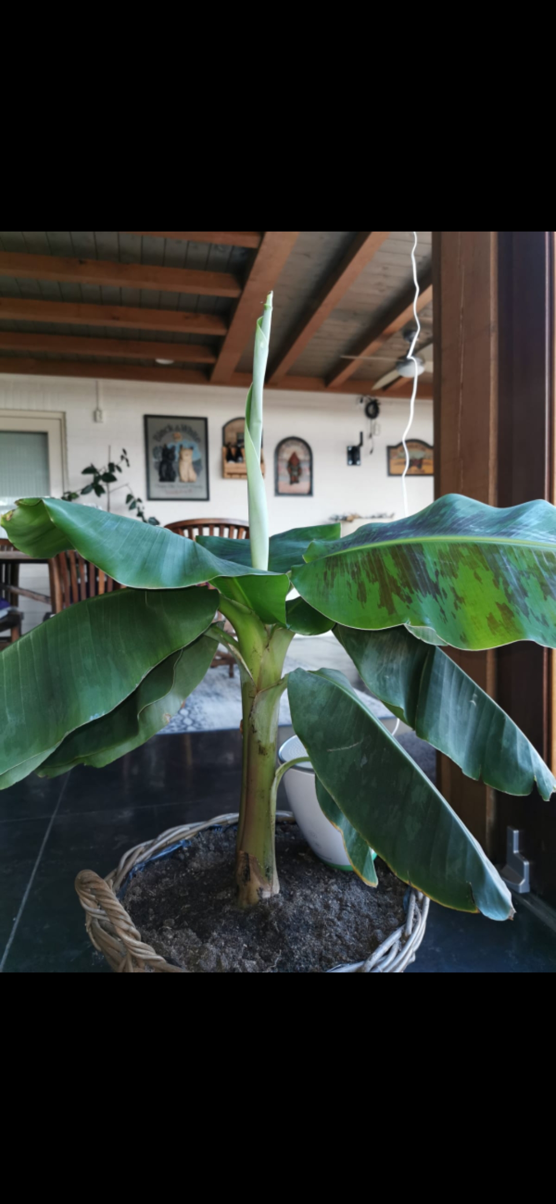 Ruim een jaar geleden mocht mijn moeder een plant uitkiezen bij de postcode loterij. Ze had toen voor mij voor een bananenplant gekozen. Ik had me er toen nog niet zo in verdiept en hij is uiteindelijk dood gegaan dit voorjaar aan spint of wortelrot (ik had geen gaten onderin de bak). Ik heb toen de stam helemaal tot de grond afgesneden en rizoom toen in nieuwe grond gezet in een kweekpotje. Nu komen er 2 pups omhoog die hun eerste blaadje eruit hebben, maar ben nu eigenlijk wel benieuwd wat ik nu straks voor plant ga grootbrengen haha.