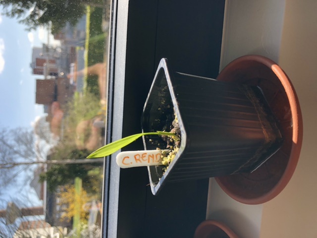 Een korte update over de Cyrtostachys Renda: mijn eigen zaailingen zijn nu begonnen aan hun tweede blad. Dat vind ik toch al een klein succes. Het vraagt wel wat inspanning: ze zitten in een klimaatgecontroleerde ruimte met kunstlicht. De temperatuur schommelt tussen 32 C overdag en 28 C 's nachts. Ik heb mezelf niet kunnen inhouden en ze hebben ook een sproeibeurt met GA3 gekregen om op gang te komen/blijven. Eentje heeft het niet gehaald, want die heeft een halve dag zonder water gezeten.