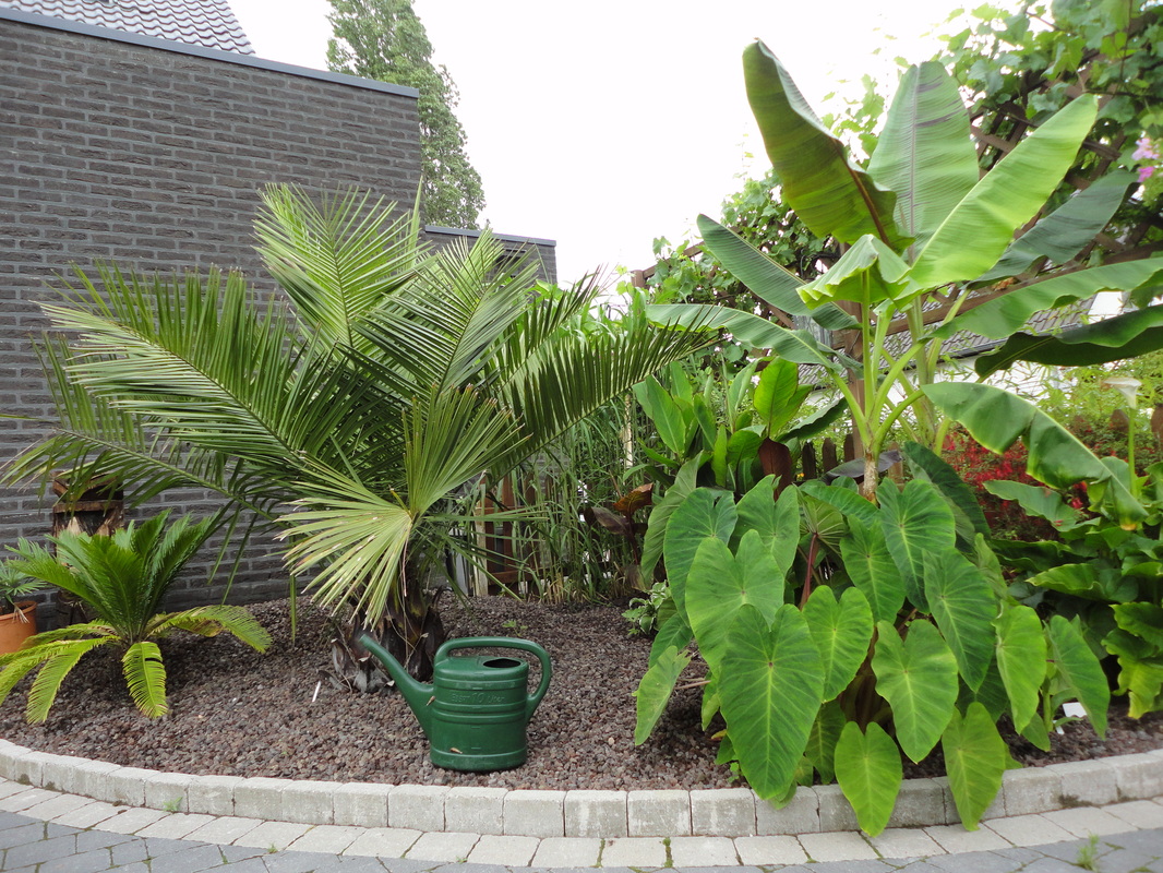 Heb er +100 staan . Is idd leuk om ze te zien groeien tot palmen van formaat al moet je er het geduld voor hebben . Daarom hebben we er enkele als groter exemplaar gekocht als basisplanten om dan de rest van de tuin verder aan te kleden met hobbykweek of bezoek aan kwekers , beurzen of tuincentra . Onze tuin is nu ongeveer 10 jaar in beweging en begint aardig vol te staan . De laatste jaren ben ik wel meer verslaafd geraakt aan de colocasia soorten en ben ik met het zaaien van palmen gestopt ( ik heb er ook meer als genoeg ) .