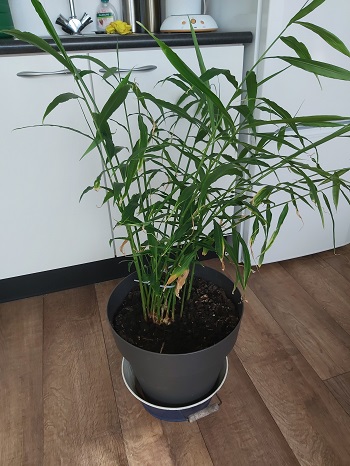 De naam van de gember is zingiber officinale word max 1 meter hoog met bleekgele bloemen , of het seizoen lang genoeg voor is voor bloei hier bij ons dat is een andere vraag , deze periode staat die best buiten zodat die genoeg licht krijgt en op tijd voedsel en water