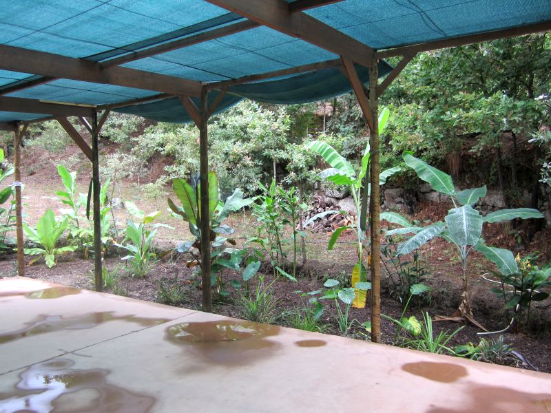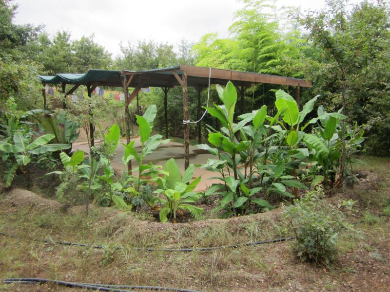 Vorig jaar hebben we een buitenvloer laten storten van 5x10m (mijn vrouw geeft yogales en nu kan dat dus ook buiten). Later in 2019 heb ik daar een 3m hoge overkapping met schaduwdoek overheen gebouwd en afgelopen voorjaar heb ik er een L-vormige tropenborder omheen aangelegd. De korte arm van de L is ongeveer 7m lang, de lange arm van de L is ongeveer 14m. Eerste reeks foto's: aanleg border april 2020. Dwz omspitten, met de houweel ondergrond loshakken en wortels verwijderen, vervolgens laag zelfgemaakte compost aanbrengen.