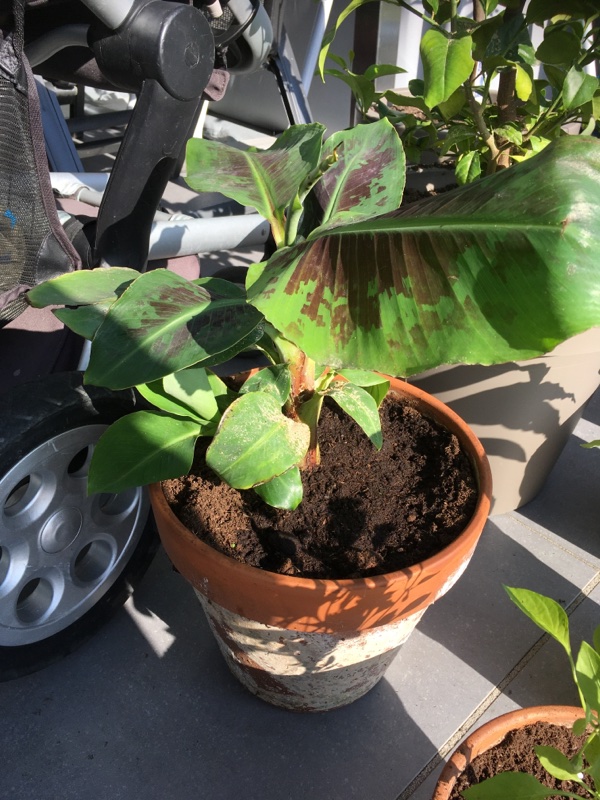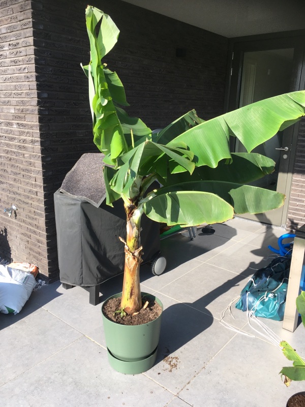 De dwarf cavindish staat in de pot buiten (bovenkant blad nu 2m.)