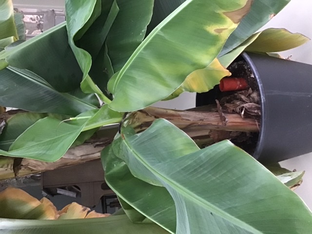 De bananen rijpten aan de plant totdat ze geel werden en vielen er spontaan af. We hadden dus wel iets eerder kunnen oogsten. In totaal zo’n 14 bananen en nog wat kleine beginsels die niet volgroeid werden.