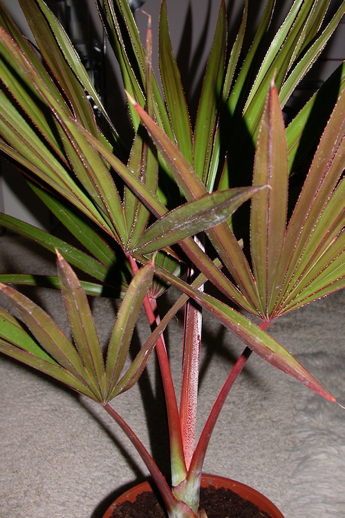 Naar mijn ervaring is de rode bladkleur bij Latania lontaroides kenmerkend voor jonge planten maar tevens variabel. Bij oudere exemplaren (binnenshuis) resteren alleen de rode bladranden en heeft het blad een diepgroene glans.
