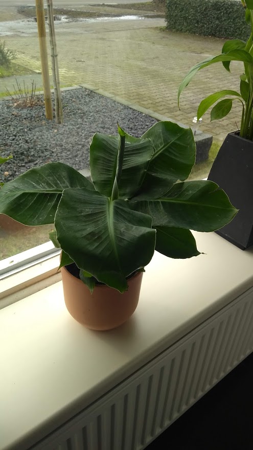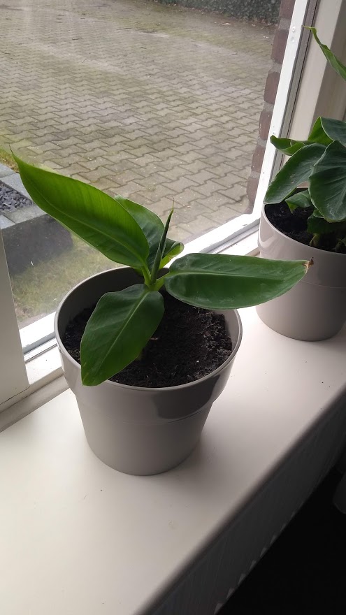 Ik weet ff niet goed waar te beginnen. Sinds de zomer dacht ik joh, ik ga eens kijken of ik een bananenplant ook net zo groot kan krijgen als die mooie foto's van google, :fluiten: een banenenboom dus. Zo gezegt en zo geregeld dat ik een bananenstekje via een kennis heb gekregen, wel 3 blaadjes groot. Hij kwam net boven het bekertje uit. Inmiddels is hij 38 cm groot incl pot en hooguitstekend blad :mrgreen: en heeft hij 2 baby's gekweekt, waarvan 1 heb geprobeerd te stekken, maar dat was geen succes, er kwamen geen worteltjes aan.. dus hoop opgegeven.. Wanneer is het beste om een stekje van mama af te halen? Ik zie dat inmiddels baby die over is gebleven ook een baby aan het kweken is.. Kleinkind dus onderweg... :mrgreen: