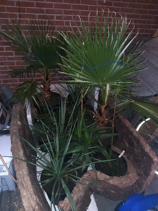 Zaailingen (Sabal minor e.a.) kijken toe hoe de Wagnerianus en Chamaerops humilis de winter trotseren.