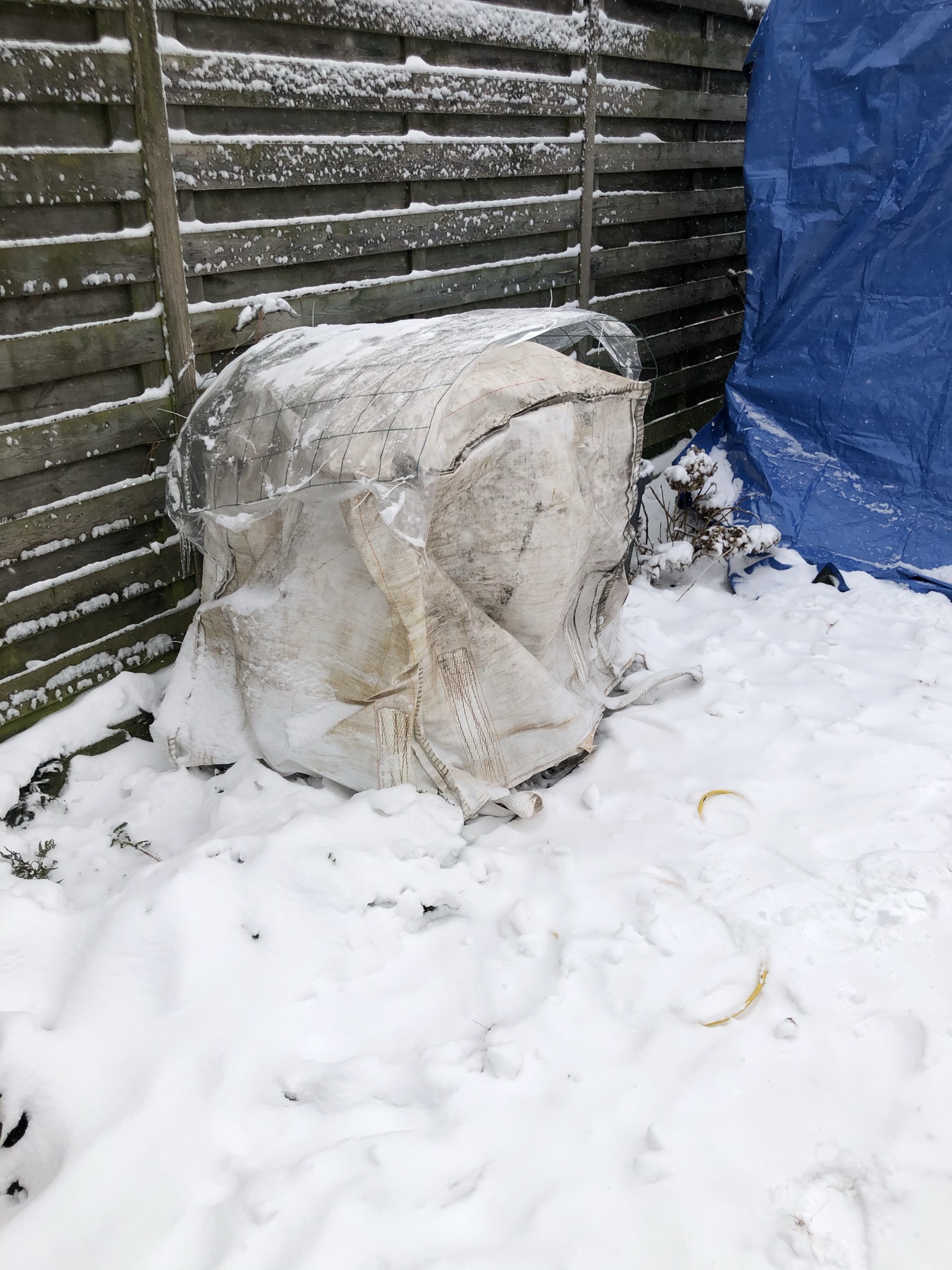 De oostenwind werd me toch te gortig, zondag heb ik de kroon van mijn grote Trachy toch ook samengebonden en met een paar lagen worteldoek ingepakt. Iemand een idee of dat voldoende ademt eigenlijk?