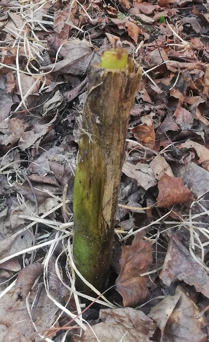 Nu dacht ik een week terug dat hij wel helemaal zou zijn afgevroren tot de grond. Nu blijkt dat er nog 20 cm stam keihard overeind blijft staan. Hij was dubbel zo hoog, maar door inzakking van het materiaal is de rest erbovenuit gaan steken. Dat deel is dus wel bevroren.