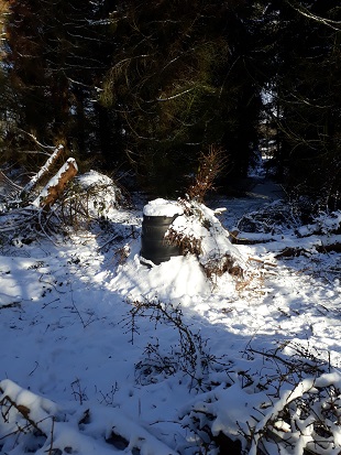 Vlakbij de Chamaerops staat een kleine Trachy. Deze had bij de prik houtsnippers en groene sparrentakken rond de voet, in de ijsweek verder nog van binnen naar buiten een stuk vloerbedekking, een compostton, sparrentakken aan de oostzijde en een laag sneeuw. Openingen onderaan en in de deksel van de ton zorgden voor ventilatie. De bladeren raakten de ton nergens.