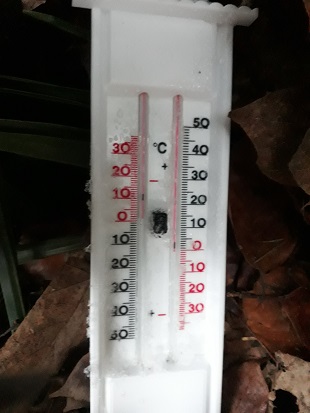 Bij de voet heb ik een min-maxtermometer geplaatst. Geen geijkte digitale apparaten, maar een indicatie geven ze natuurlijk wel.