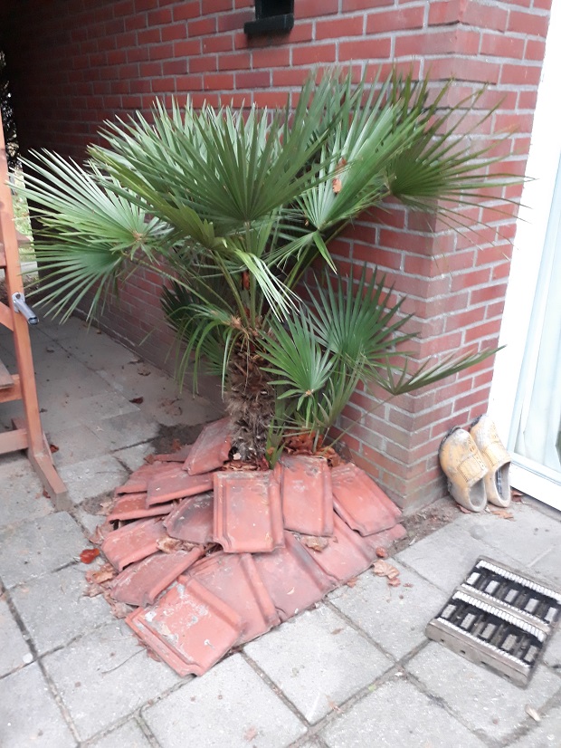 - Chamaeropsen heb ik nu een tweeënhalf jaar, en sinds dit jaar uitgeplant. In het algemeen kan ik zeggen dat Chamaerops droog valblad en daarover dakpannen hebben gekregen toen de natte kou plots inviel. De twee forse exemplaren die ik pas sinds deze zomer heb (zie ook pagina 3 van viewtopic.php?f=9&t=24343&start=20 ), heb ik wat meer beschermd dan de andere. Weet namelijk niet wat ze voorheen hebben meegemaakt. Deze hebben na de eerste prik een extra bult droog herfstblad tegen de stam gekregen, en toen het gisteren begon te sneeuwen/ijzelen toch ook maar een luchtige muts van vliesdoek. Een aantal kleintjes staat in een zuidtalud geplant, deze hebben wat hooi en een kuip gekregen toen de natte kou in aantocht was. De andere hebben al wat meer bewezen en naast de genoemde wortelafdekking een plu (de kleine Chamaerops uit het begin van deze draad) of een parasol.