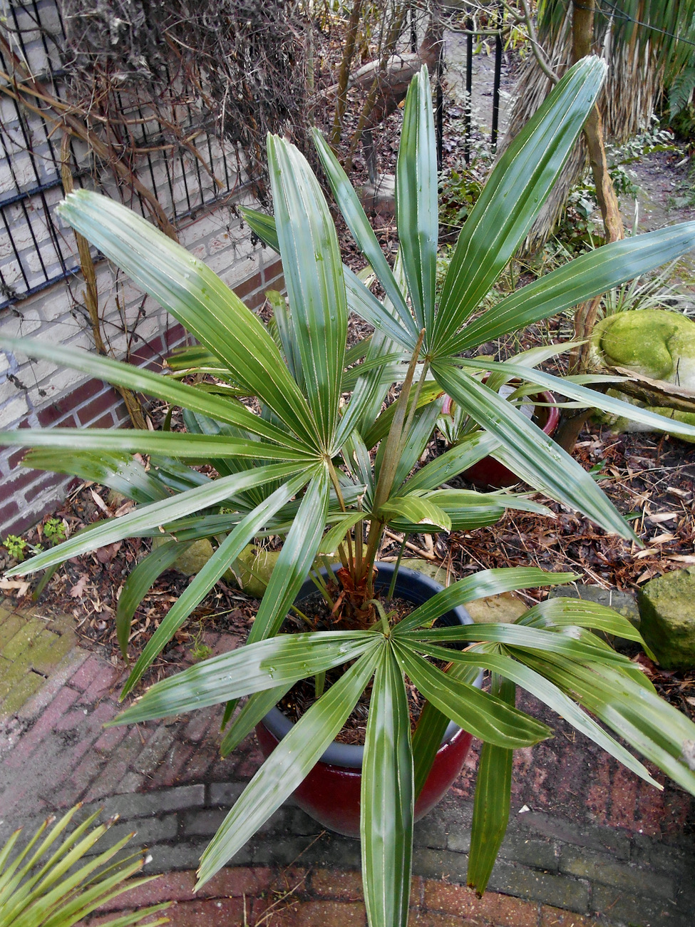 Dit topic weer even opgedoken, Hoe is het met de Rhapidophyllums? Na afgelopen winter en nu halverwege deze winter geen enkele schade weer. Eigenlijk groeit deze al sinds 2009 zonder problemen. Maar is het een spectaculair geval? Nou niet echt. Ik vind het niet echt een blikvanger. Maar ik hem m ooit aangeplant als experiment en doe er helemaal niets aan. Onlangs nog een fotootje gemaakt. De groei is nog steeds gemiddeld 2 bladeren per jaar. Maar het laatste blad rijkt met de punten ongeveer 1 m hoog nu. De zijscheuten vallen niet echt op, maar ik hoop dat die nu ook de palm een wat bossiger uiterlijk gaan geven. Hij staat bij mij redelijk onbeschut in de voortuin, dus de bladslippen knakken nogal eens.