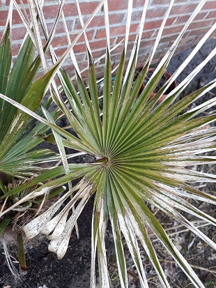 Ik heb twee gehavende Trachys van iemand overgenomen. Vanwege de bladschade waren ze flink "gesnoeid", maar ik durfde het toch aan. Stevige stam, speren en wortels. Ze stonden nog van de vorige bewoner in de tuin, en hebben een jaar of 6-7 in de volle grond gestaan. De nieuwe bewoner had op internet het schadebeeld opgezocht en geconcludeerd dat het van teveel kalk zou zijn. Daar heb ik mijn twijfels bij, wat maken jullie ervan?